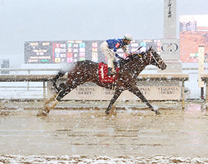 Digital Ops romps in the snow to win the $100,000 Golden Horseshoe Handicap at Colonial Downs on March 12, 2026. Photo credit: Coady Media